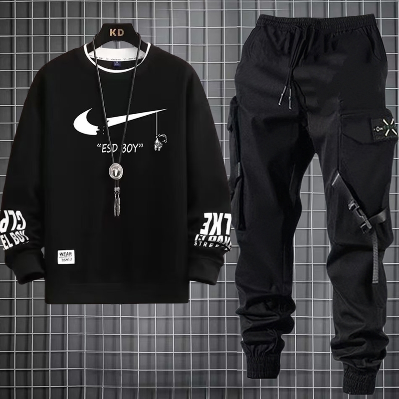 Conjuntos De Moda Masculina Manga Longa Solta Camiseta Com Capuz Solto Tendência + Calça De Carga Joggers Preta Mais Fato Masculino Tamanho