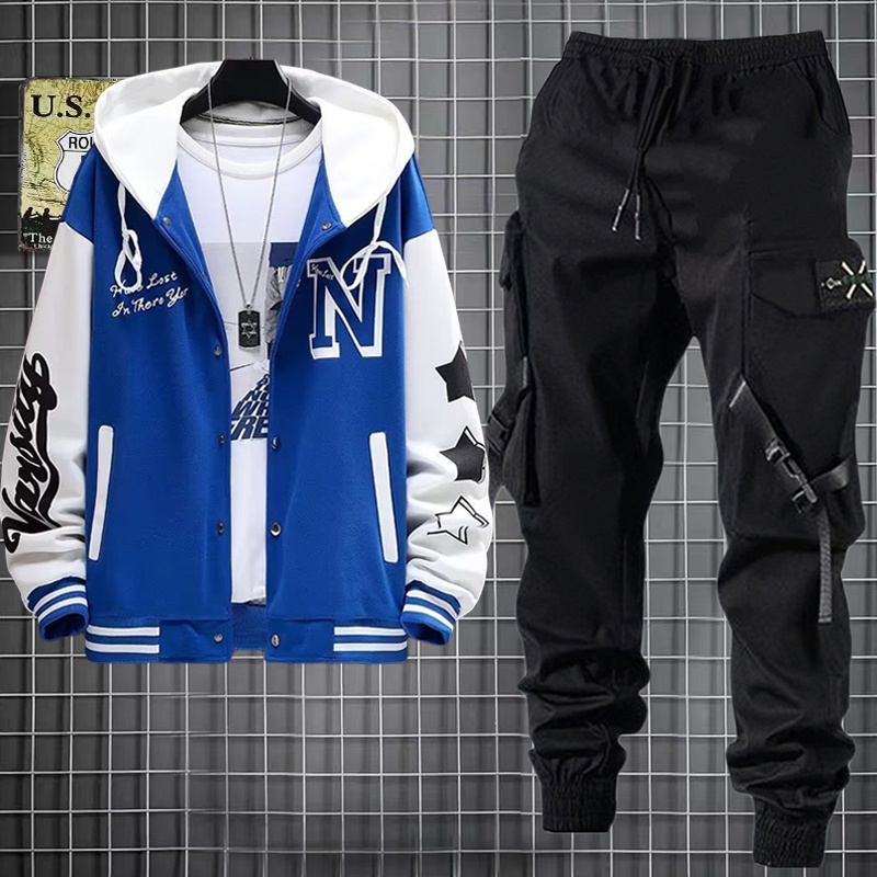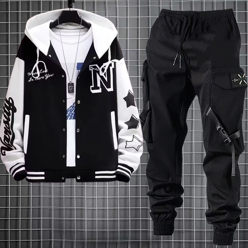 Conjunto De Moda Homem Casaco Com Capuz Camisetas Tendência Capuzes + Calça De Carga Joggers Preta
