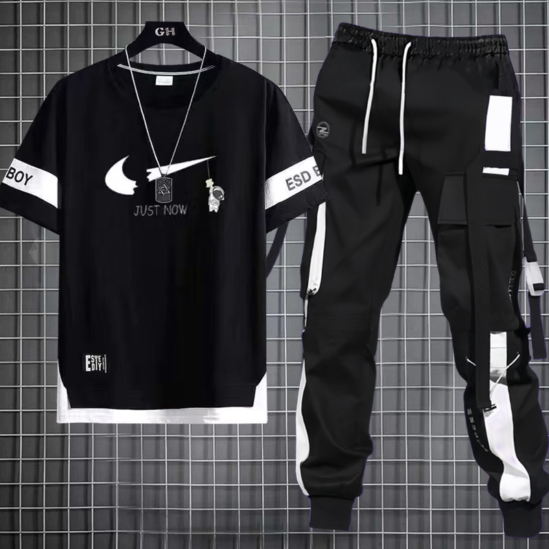 Conjunto Masculino Camiseta Moda Manga Curta Casual Masculina Roupa + Calça De Carga Corrida Preta