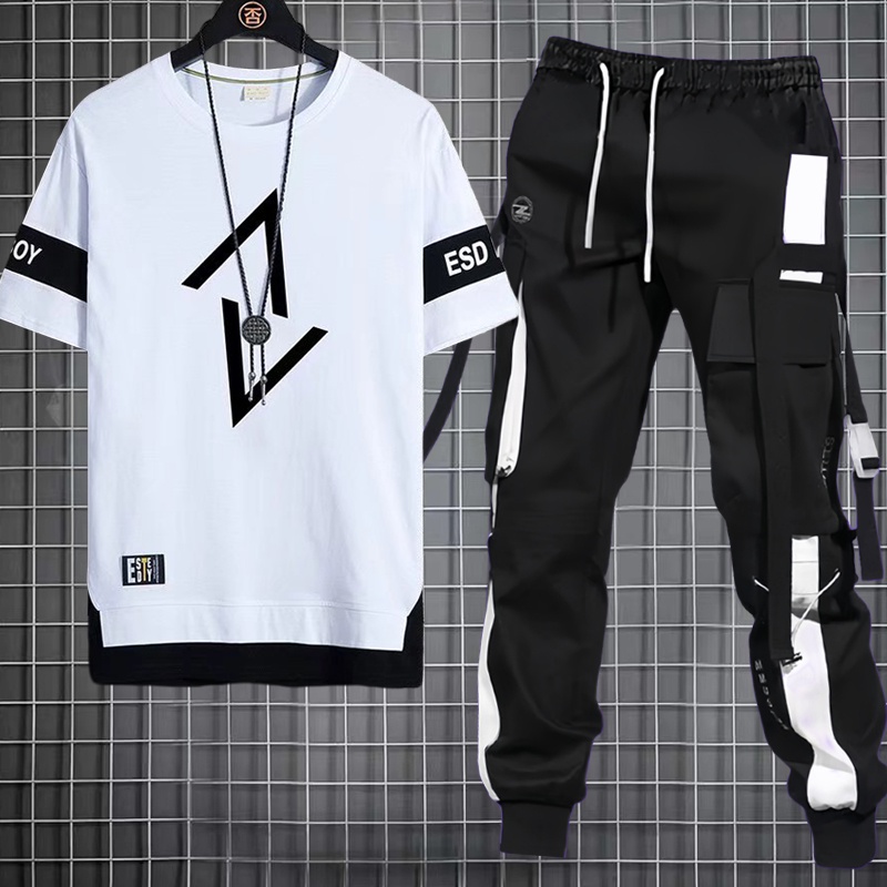 Calça De Carga Masculina Estilo Hip Hop Joggers + Conjunto De Moda Com Camiseta Casual De Manga Curta