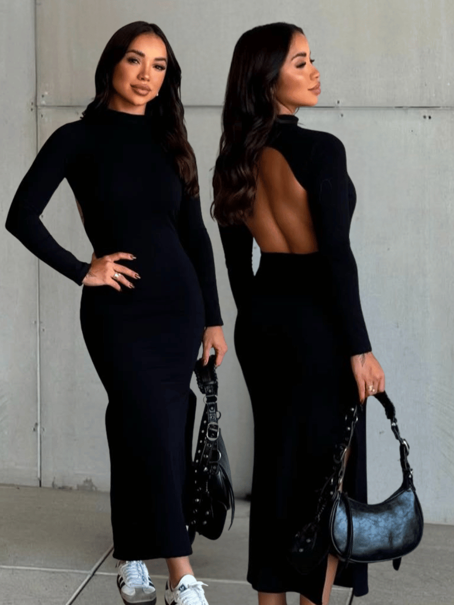 Vestido Midi Longo Manga Comprida Costa Nua Gola Alta Com Fenda Na Lateral