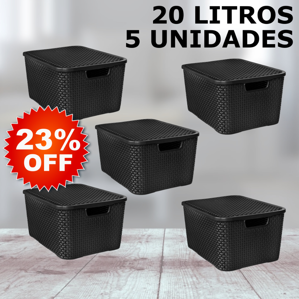 Kit 5 Caixa / Cesta Organizadora Grande 20 Litros Empilhavel Rattan Preta - Cesto Organizador 20L Para Guardar Coisas , Brinquedos