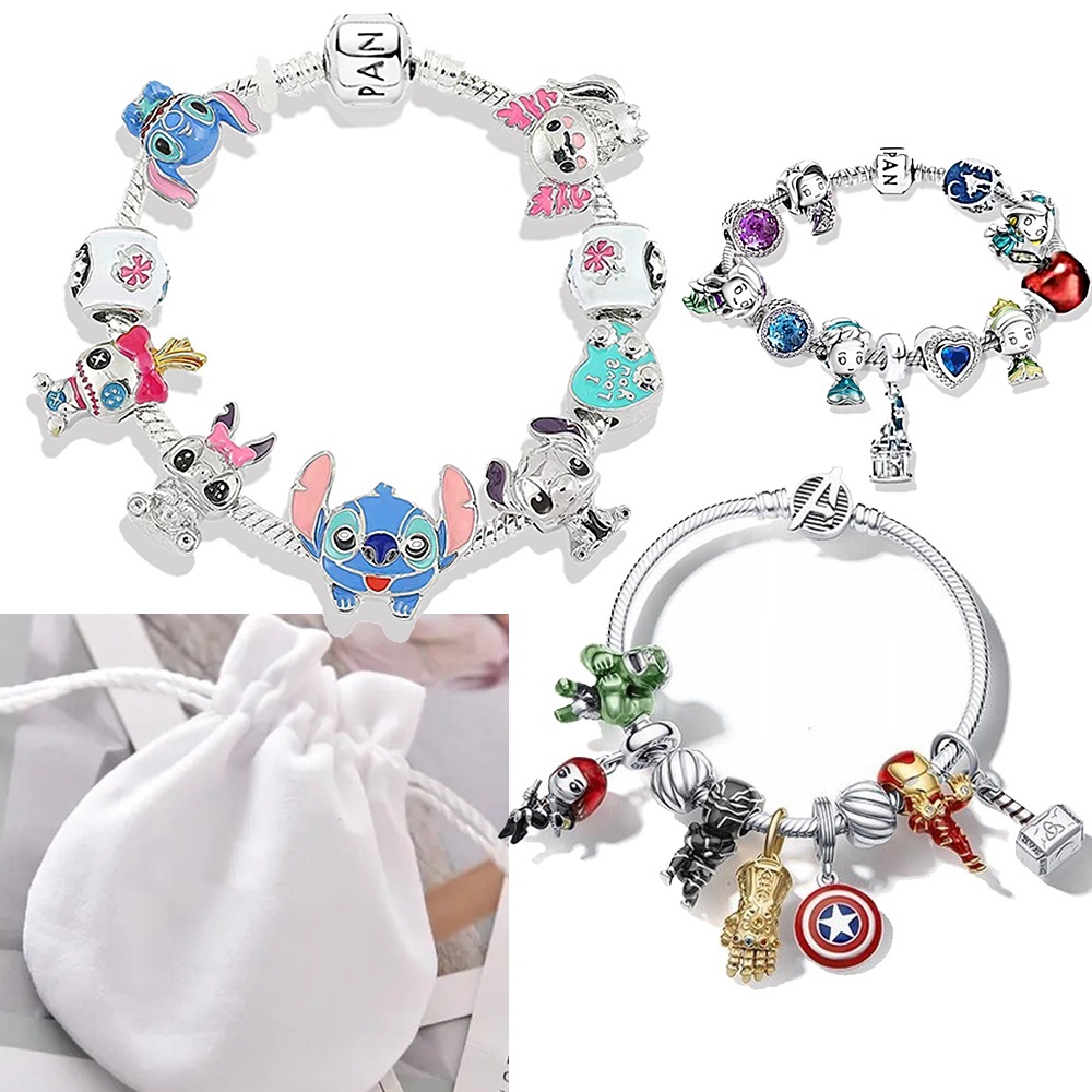 Pulseira com Berloques Marvel Amuleto de Costura Lilo e Prata 925 Corrente 19cm