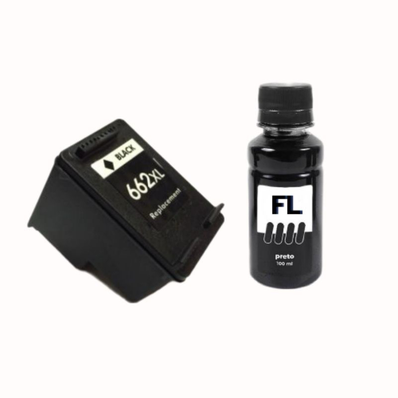 kit com 1 cartucho 662 preto cheio e 100 ml de tinta Black Deskjet Ink Advantage 1015, 4645, 2645, 1515, 2515, 3515, 3545, 2545
