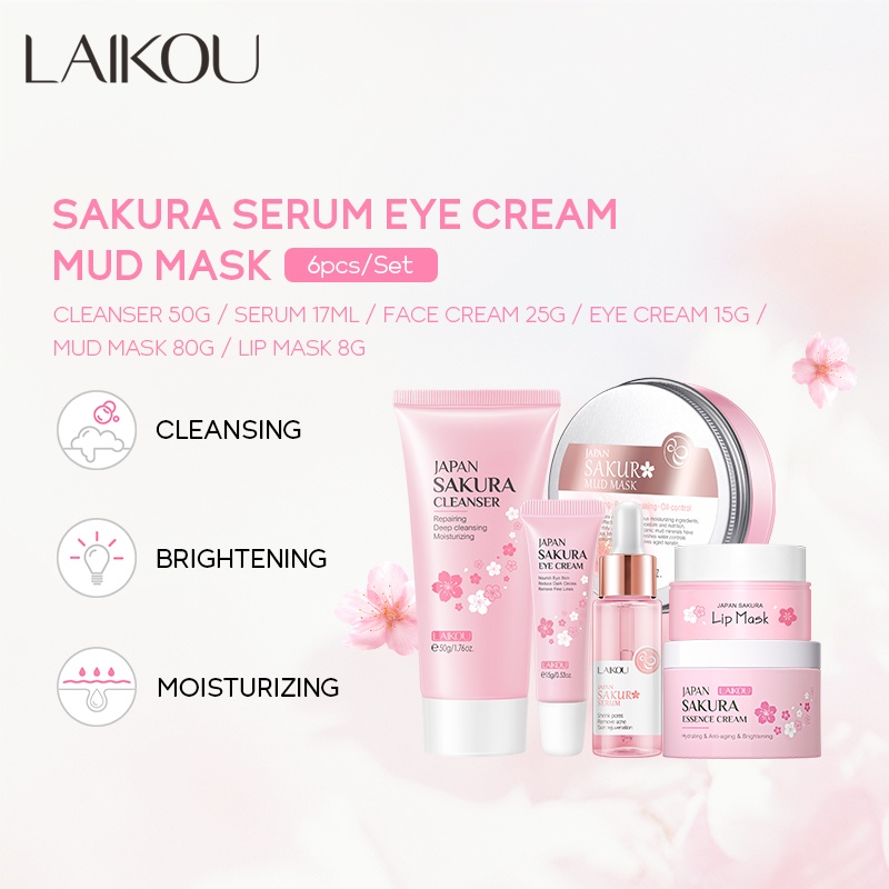 LAIKOU Sakura Brightening Skincare Set Kit De Viagem Com Soro Facial Washbag Creme Hidratante Para Os Olhos Liso