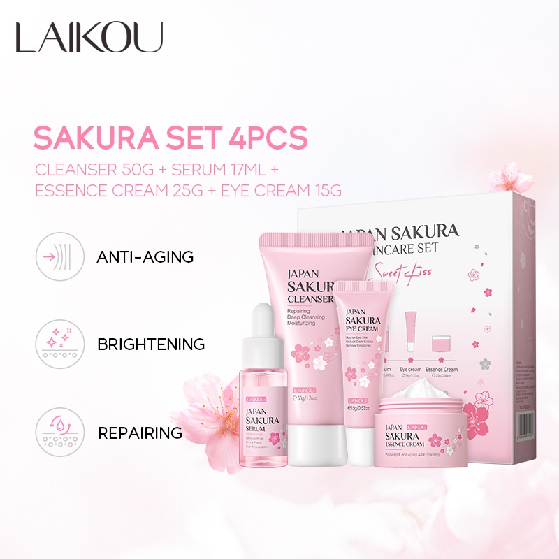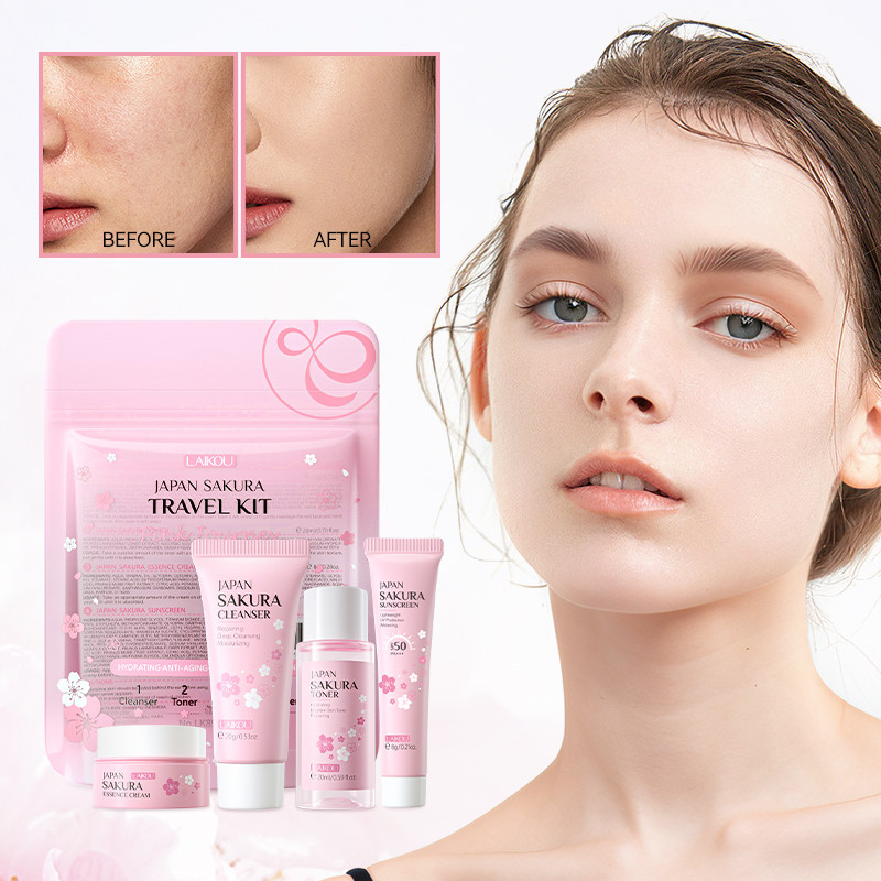 LAIKOU Japão Sakura Travel Skincare Set Anti-aging Brightening SKin Tone Reparador De Tom Hidratante 4Pcs