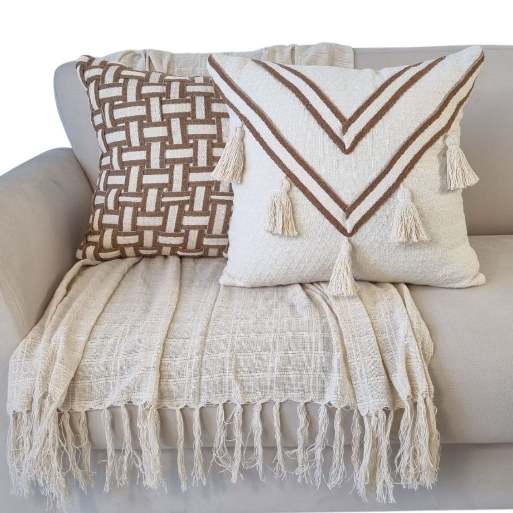 Kit Manta De Sofá 150x150cm + 2 Capas De Almofadas Pompom Boho Pingente Trance Decoração Moderna