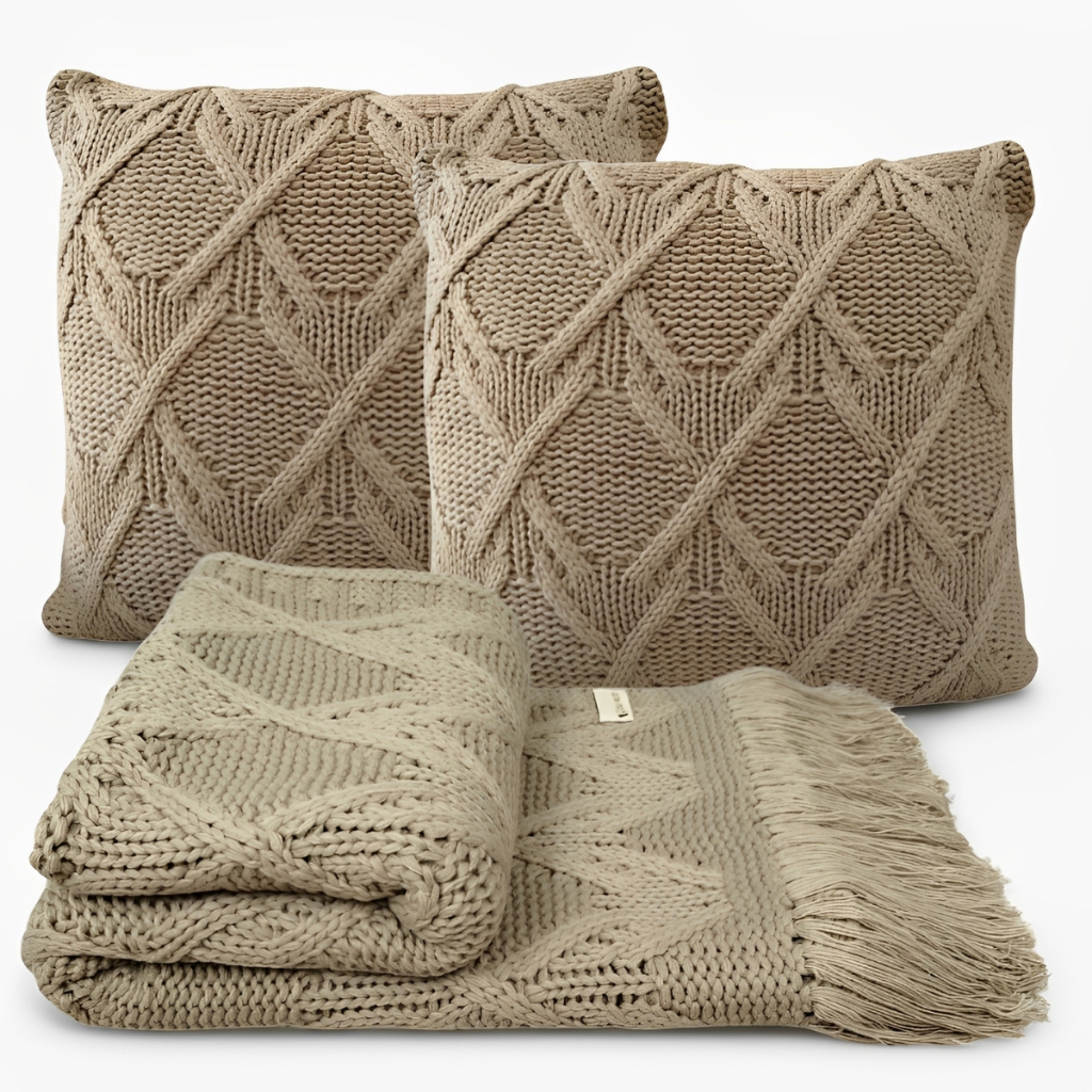 Kit Manta de Tricô + 2 Capas de Almofadas 45X45cm Sofá Poltrona Cobertor Cama 150x90cm Usufruto Decorativa Sala L6