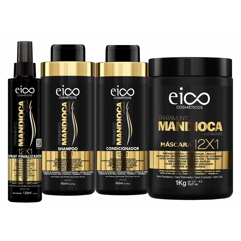 Eico Tratamento Mandioca Shampoo Sem Sal e Condicionador 450ml + Máscara Hidratação + Spray Leave-in Força Crescimento