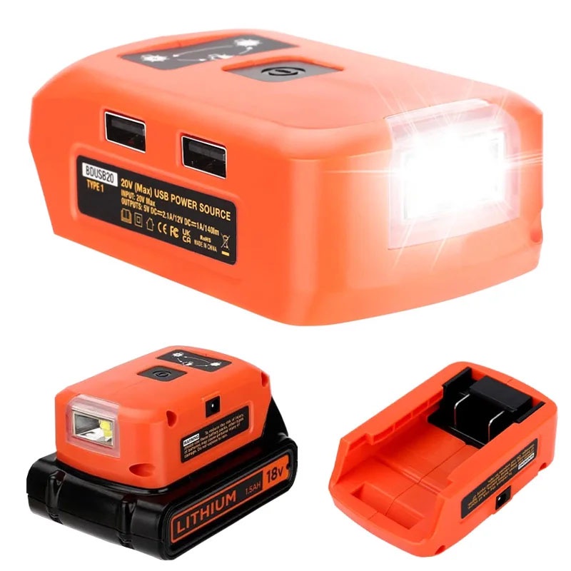 Carregador Adaptador De Bateria Para Black & Decker 14.4-20V De Íon-Lítio , Luz De Trabalho LED 3W 140LM Com Portas USB Duplas , Porta 12V DC