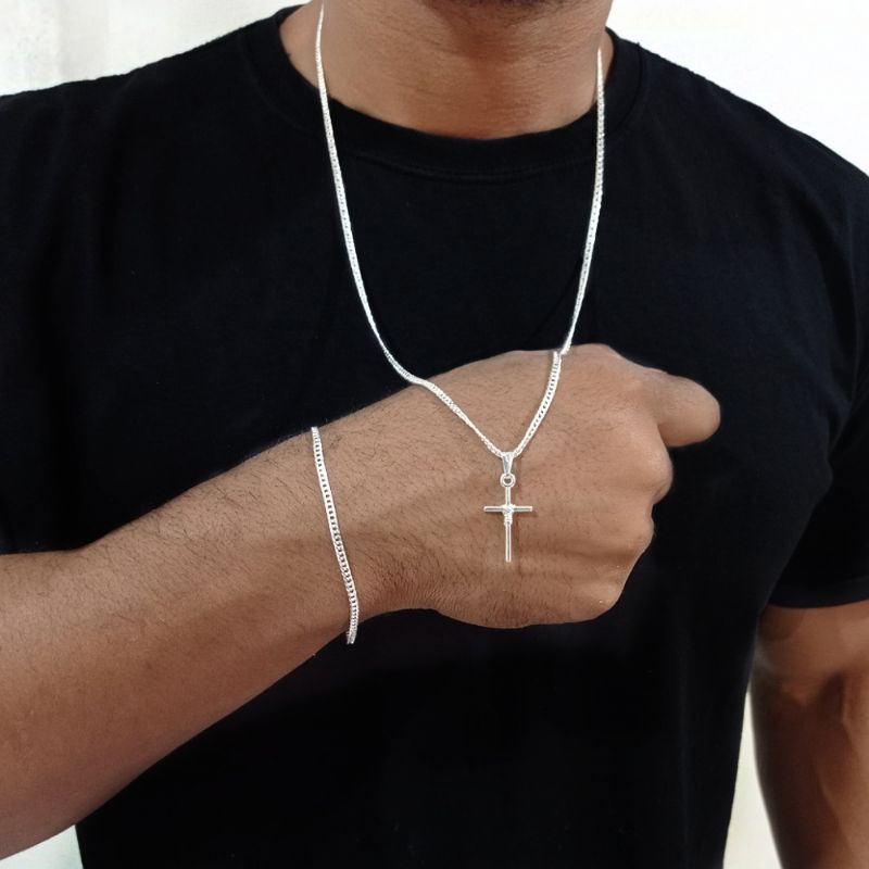 Kit Corrente Cordão + Pulseira Prata masculina Grumet Dupla 2,5mm Banhada em prata 925