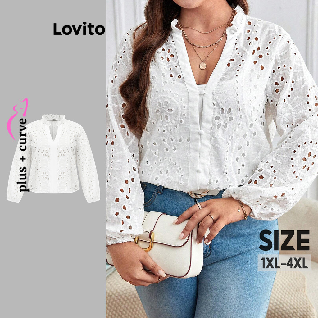 Lovito Blusa feminina com costura em tecido bordado com ilhós floral elegante e curva plus size LBL20361