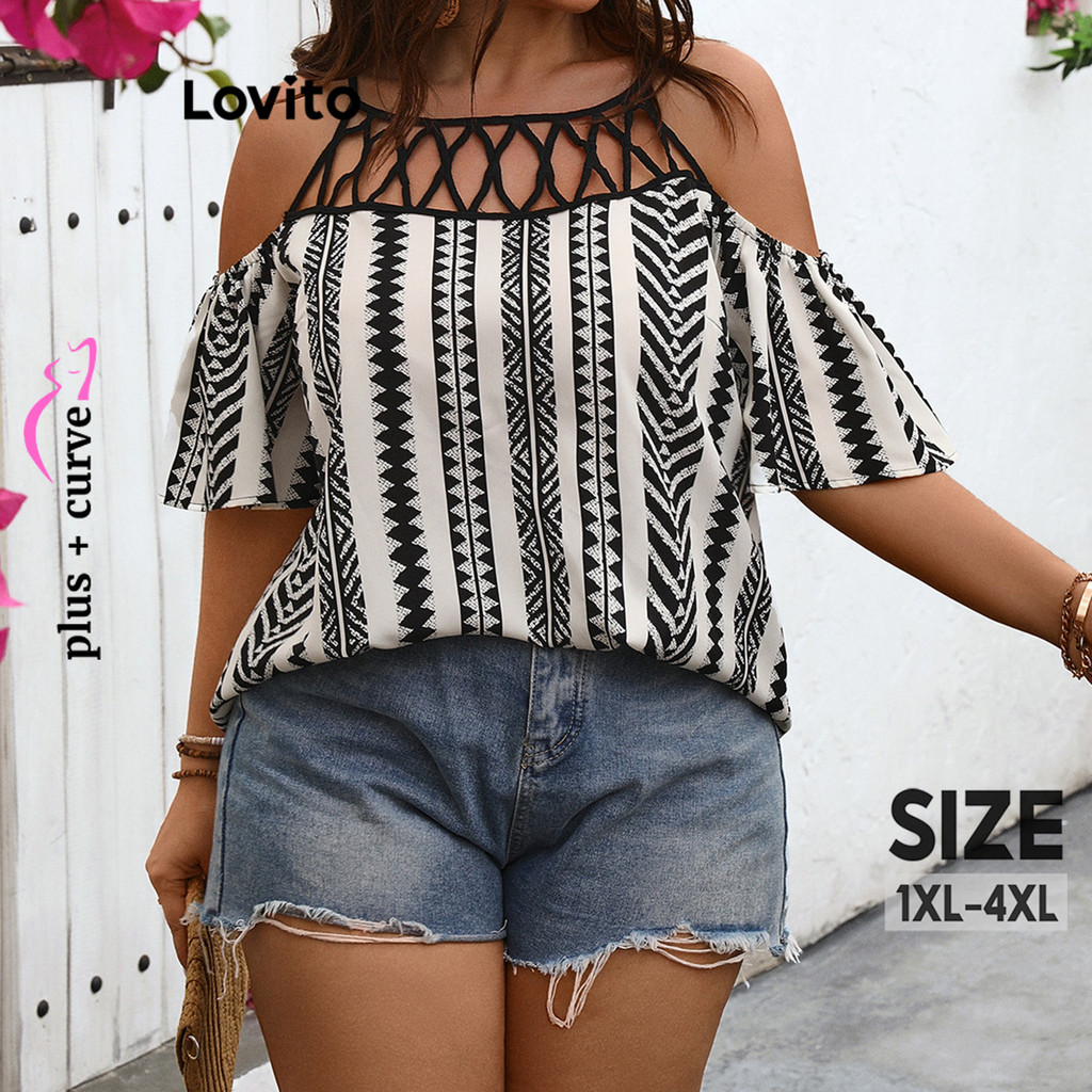 Lovito Blusa feminina plus size curva elegante geométrica com babado na frente LSL02017