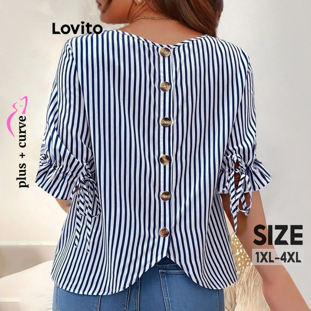 Lovito Blusa feminina plus size curva elegante listrada com botão frontal LBL12374