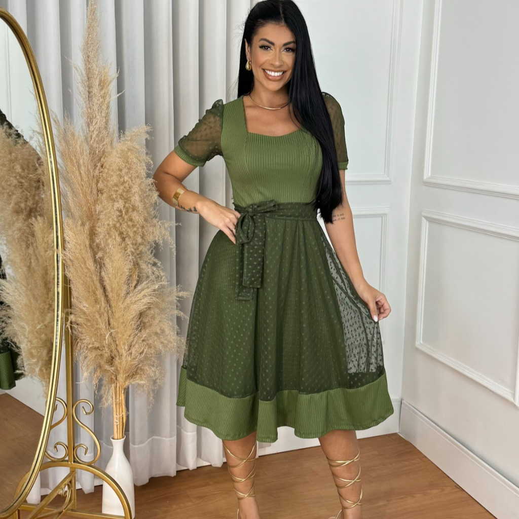 vestido mídi godê moda evangélica de tule M-G com faixa para amarar