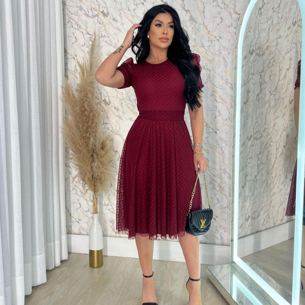 Vestido Midi Godê Rodado Tule Bolinha Poá Moda Evangélica Com Cinto