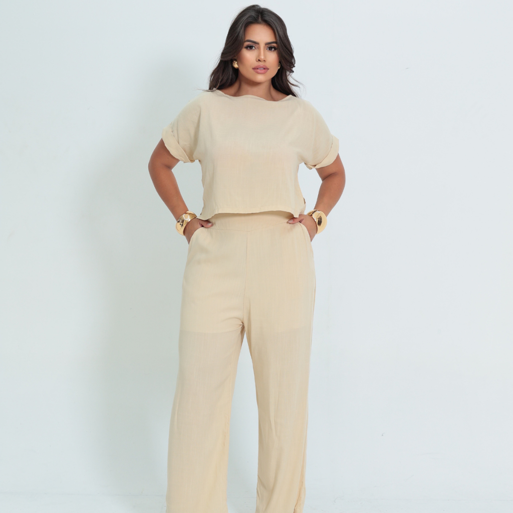Conjunto feminino duna areia calça pantalona e cropped com bojo Alça regulagem Duna