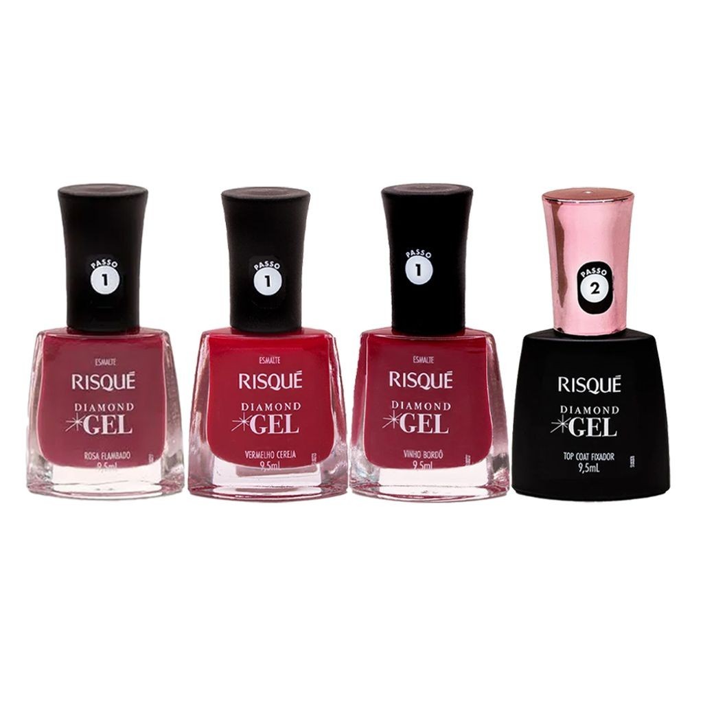 Kit Esmaltes Risqué Diamond Gel + Top Coat Fixador - 4 unidades