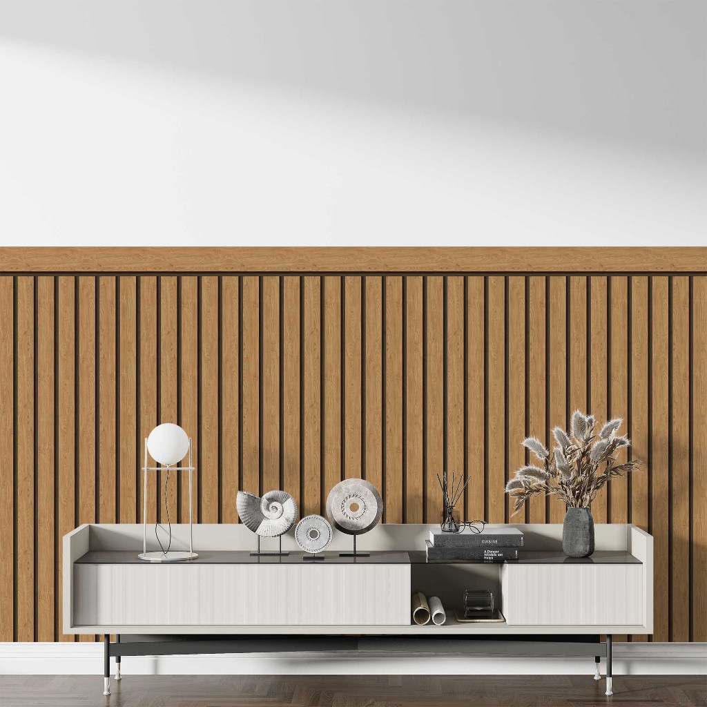 Papel De Parede Adesivo Ripado Madeira Com Faixa Para Meia Parede - Vinil Autocolante