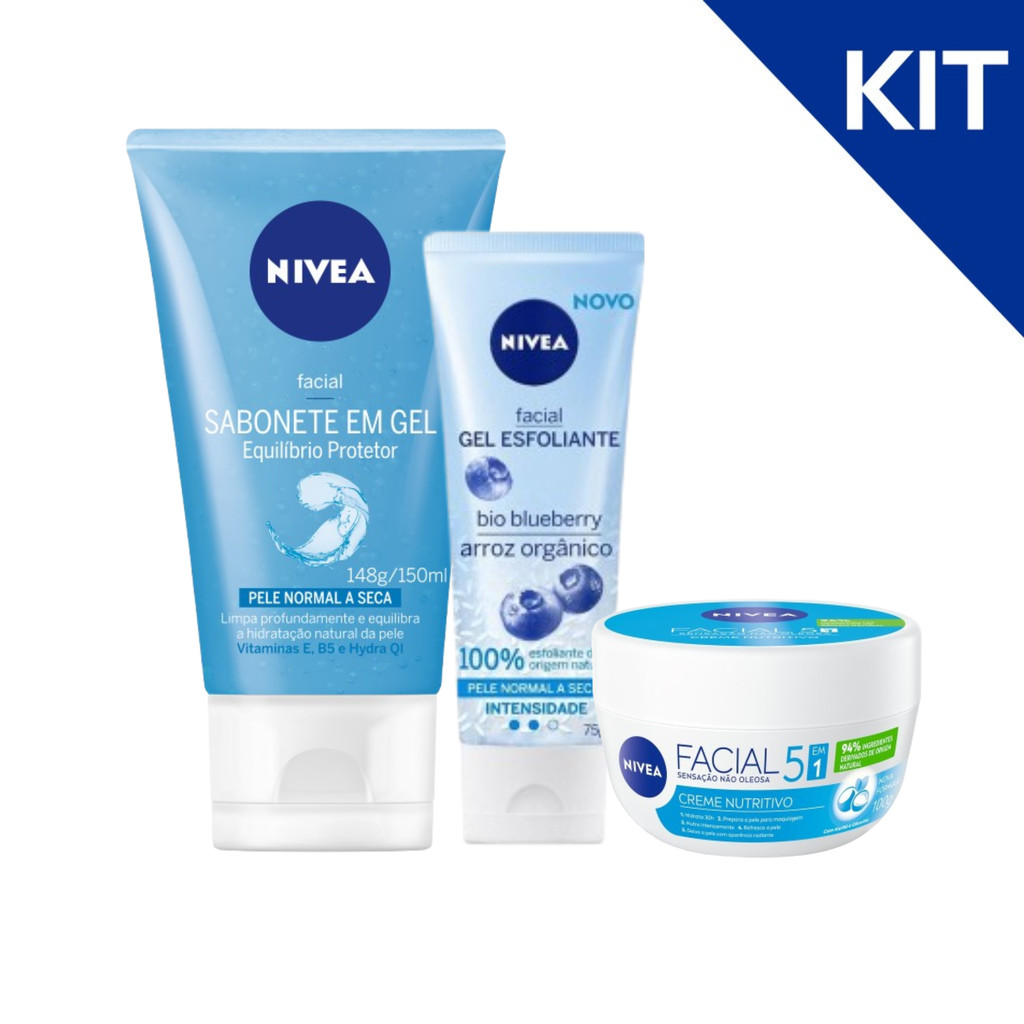 KIT NIVEA Creme Facial Nutritivo 100g + Gel Esfoliante Facial Refrescante 75g + Sabonete Facial em Gel Equilíbrio Nutritivo 150ml