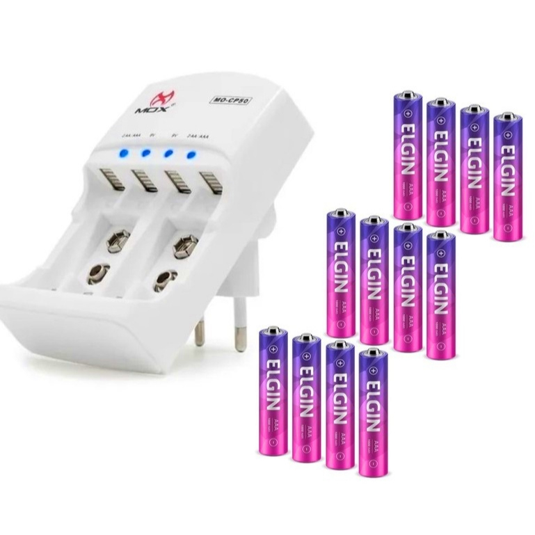 Kit Carregador Mox Com Pilhas Recarregaveis AA AAA 9V Elgin Duração até 1000 Cargas Escolha o Seu