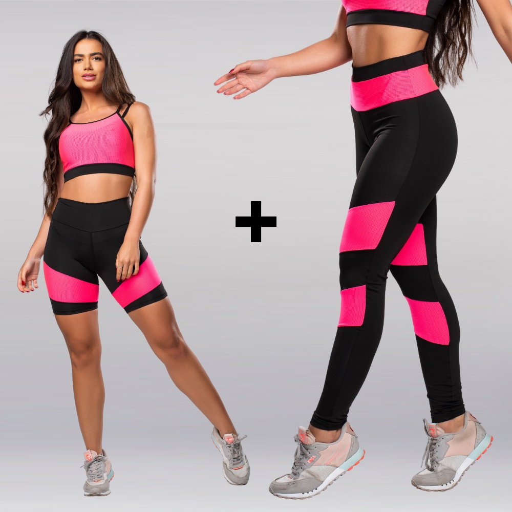 Kit Academia Fitness Top + Short + Calça Legging Com Detalhe
