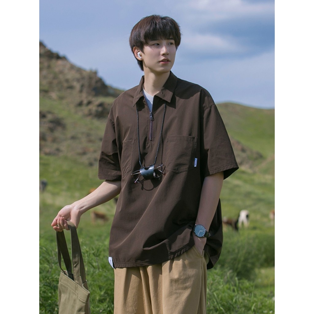 Camisa Polo Homem Manga Curta de Verão Estilo Rua de Verão Solta Estilo Montanha Camiseta Meio Zíper Estilo Homem Roupa de Vento Funcional