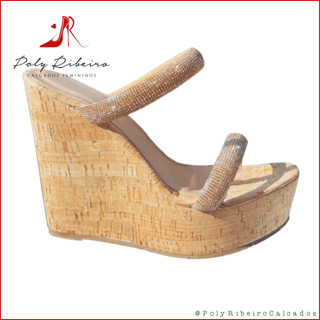 Tamanco Anabela Poly Ribeiro Tiras com Strass Salto Cortiça 13 cm