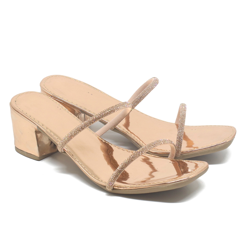 Sandália Feminina Salto Grosso Tiras Strass Dourado de Saltinho Medio com Duas Tiras Salto Blogueira Tamanco