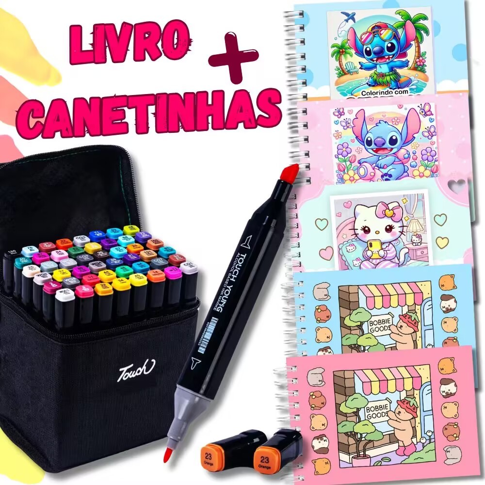 Kit Canetinha e Livro de Pintura Bobbie Goods Stitch Hello Kitty Labubu Capivara A5 Capa Dura