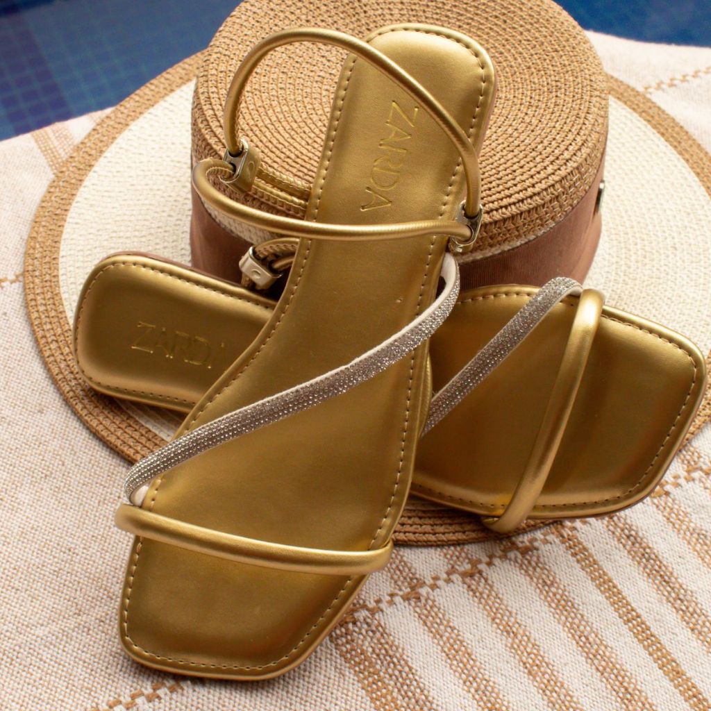 Sandália Rasteira Feminina Ajustável Com Elástico Detalhe de Strass e Brilho Solado Confortável e Macio