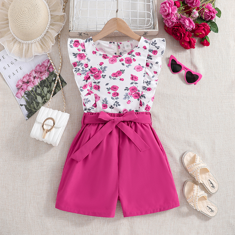 Fato de Verão para Meninas de 8-12 anos de idade Rose Sweet Style Print Sleeveless Top & Rose Red Shorts Summer Children Suit
