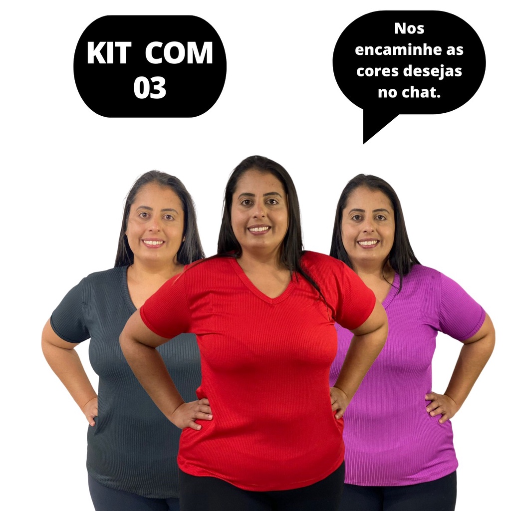 kit 3 Blusas Plus Size Feminina Canelada Manga Curta Malha Premium Tamanho Grande