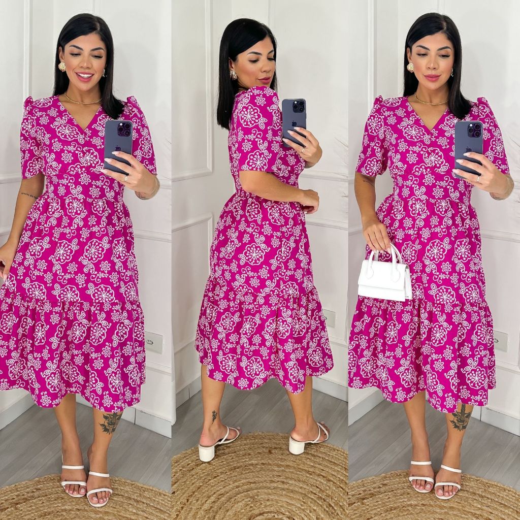 Vestido Feminino Midi com Manga Curta Botões na Frente e Elastex nas Costas - Moda Elegante