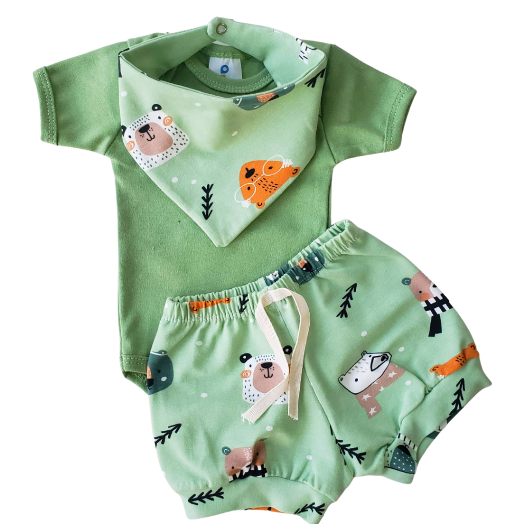 Conjunto Bebe Verão Menino Short, Body E Babador Bandana Recém Nascido