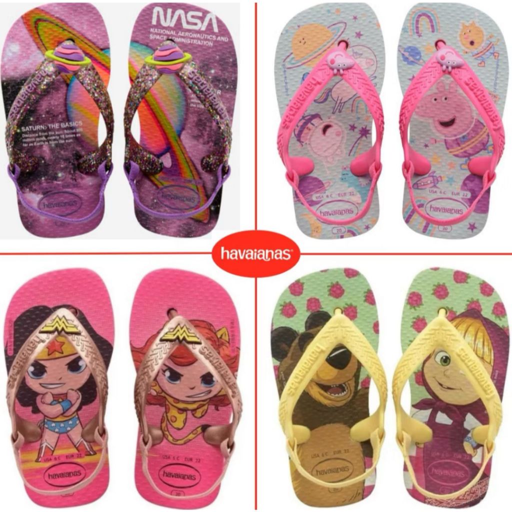 Chinelo Havaianas Baby Masha Peppa Pig Princesa Ariel Nasa Infantil Minnie Lilas Elástico Desenho