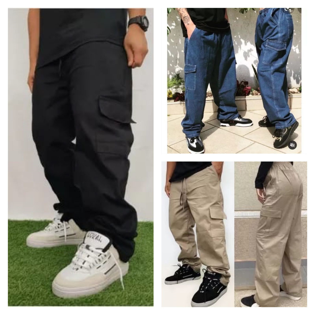 CALÇA CARGO BEGE MASCULINA E FEMININA LARGA 6 BOLSOS JEANS OU SARJA UNISSEX ESTILO SKATE