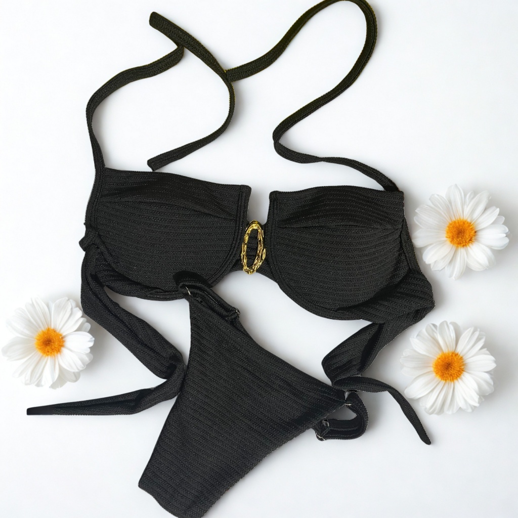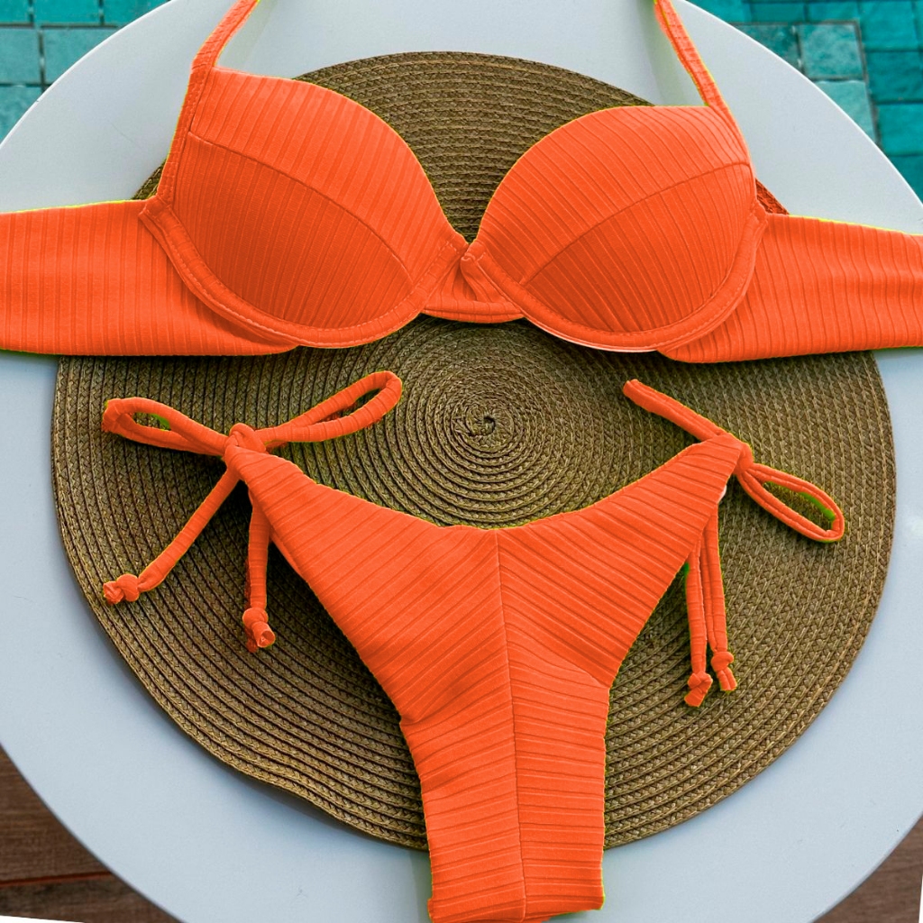 Biquini Meia Taça Canelado Com Bojo Aro Inteiro Calcinha Fio Duplo Semi Fio De Amarração Lateral