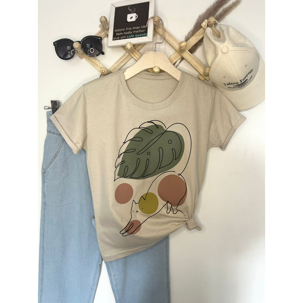 Camiseta blusa T-Shirt Feminina Algodão Gola Careca simples casual e confortável Padrão de gatinho preguiçoso