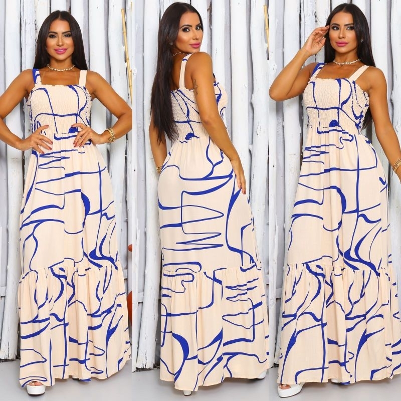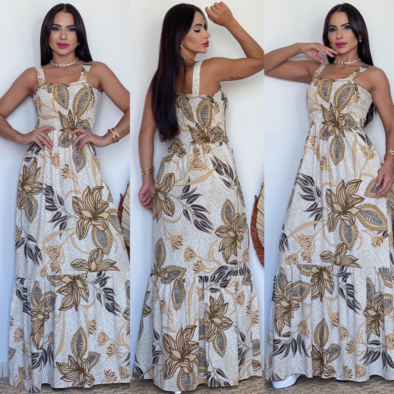 Vestido longo de alça estampado viscolinho lastex na costa 10001