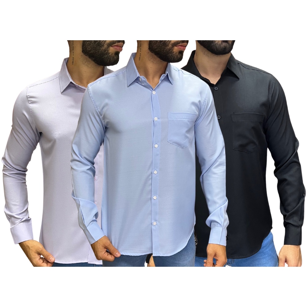 Kit 3 Camisa Masculina Social Tecido Não Amassa Camisa Social Manga Longa Com Elastano Camiseta Social Com Bolso