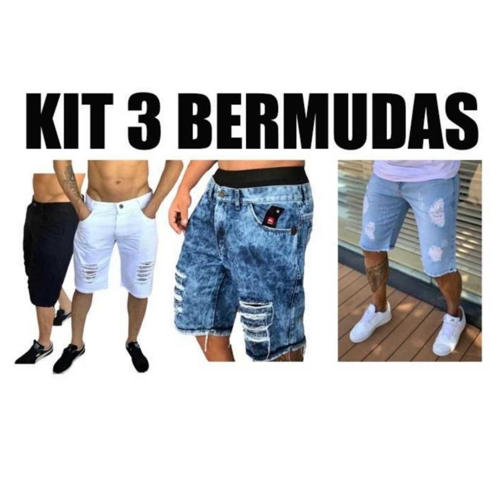 KIT 3 Bermuda jeans clara Moda masculina jeans De Ótima Qualidade Modelo Rasgada Premium