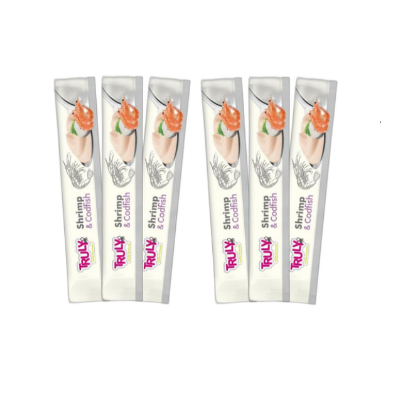 6 UN -Petisco para Gato Truly Creamy Churu Cremoso 6 tubetes - Sabor SHRIMP e CODFISH/CAMARÃO e BACALHAU - 14gx6 420gr