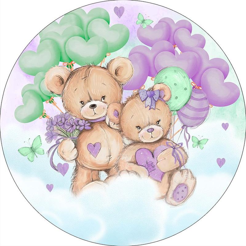 Painel De Festa Redondo 1,50x1,50 - Revelação Ursinhos Teddy Bears Lilás e Verde 054