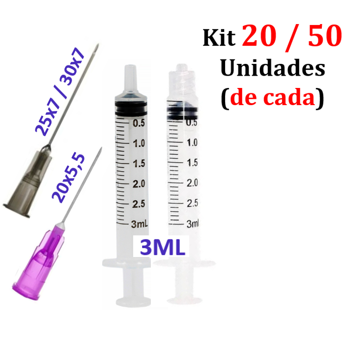 20 / 50 Unid Seringa 3ml Liso ou Rosca C/ Agulh 25x7 / 30x7 / 20x5,5