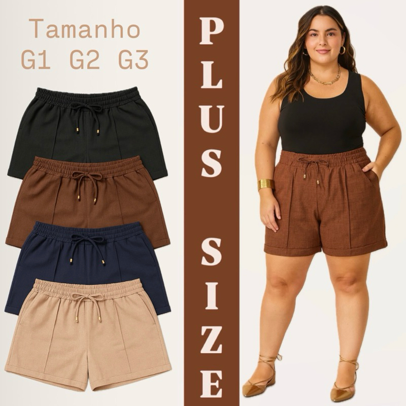 Short feminino alfaiataria PLUS SIZE verão G1 G2 G3 com elástico bolso curve linhão elegante linho