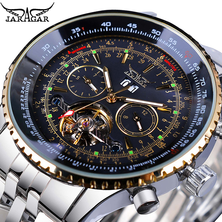 Relógio Mecânico Jaragar Marca De Grande Discagem Tuo Flywheel Oco Automático Multifuncional Luminoso De Banda De Aço À Prova D'água GMT976