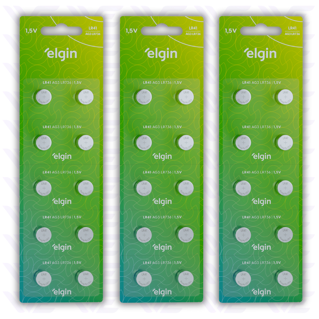 30 Bateria Pilha Elgin LR41 AG3 LR736 1,5V Alcalina 3 Cartela Blister com 10 Unidades Cada Original