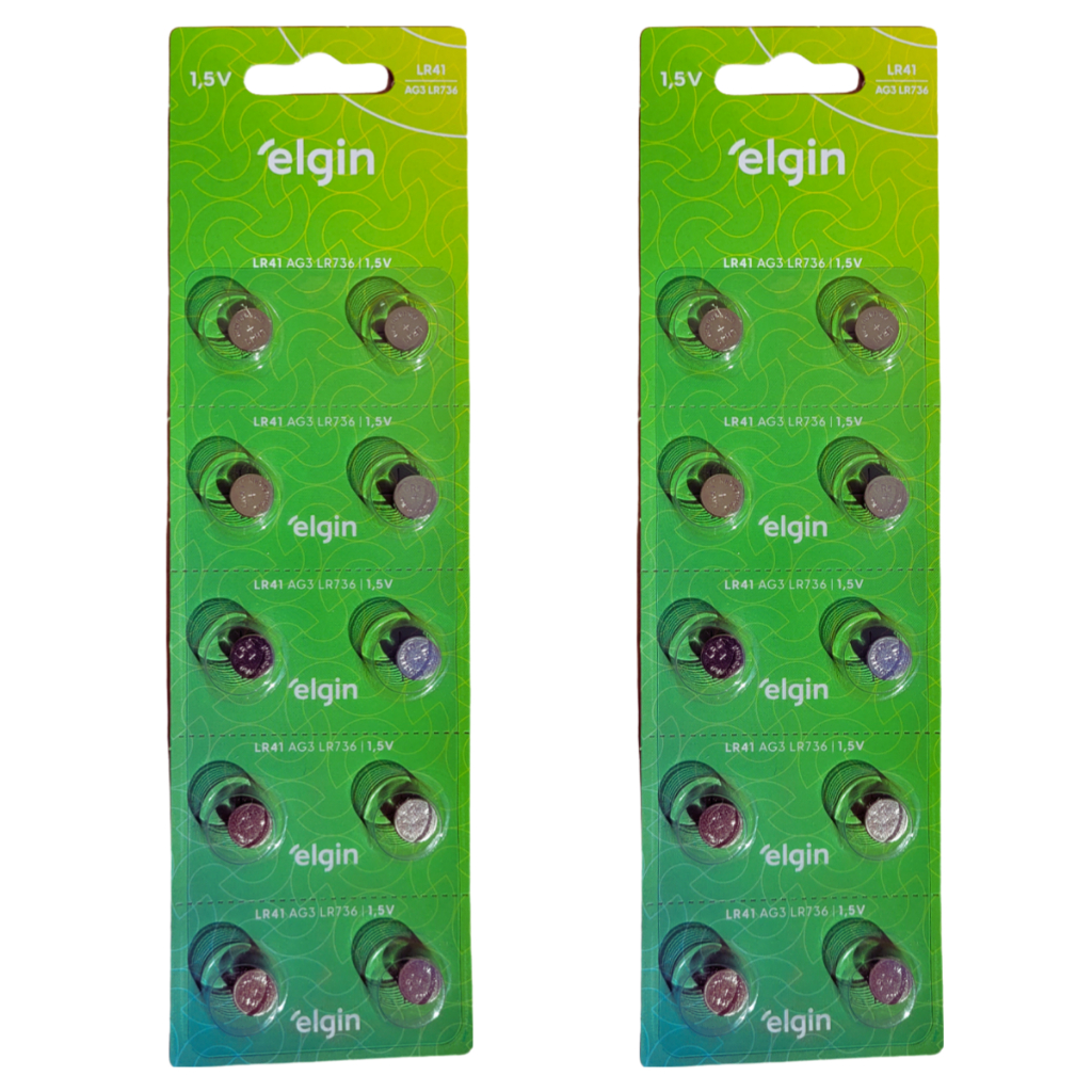 20 Bateria Pilha Alcalina LR41 AG3 LR736 1,5V Elgin 4 Cartelas Blister com 10 Unidades Original