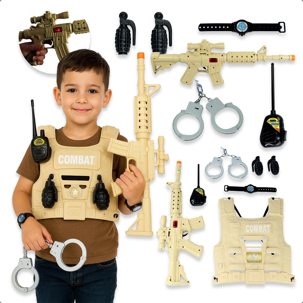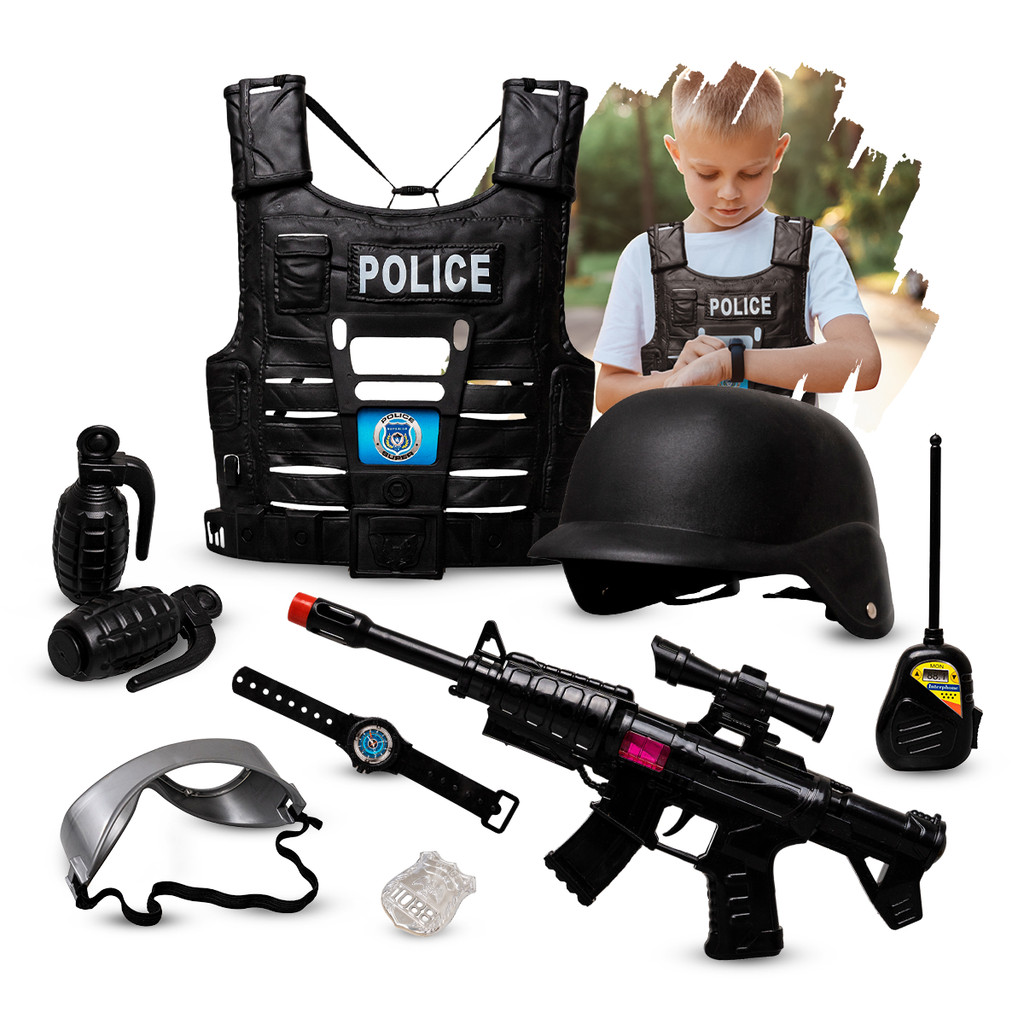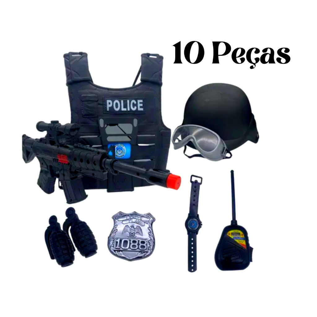 Brinquedo Kit Policial Fantasia Com Arma Capacete Colete E Acessórios Dudubrinq